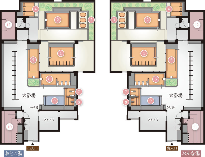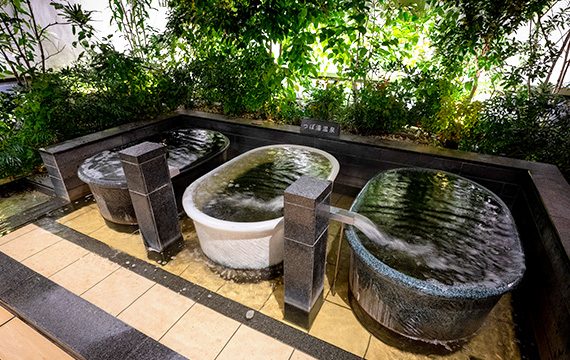 温泉は茶褐色のお風呂やテレビ付きの露天風呂など、多くの種類があります。