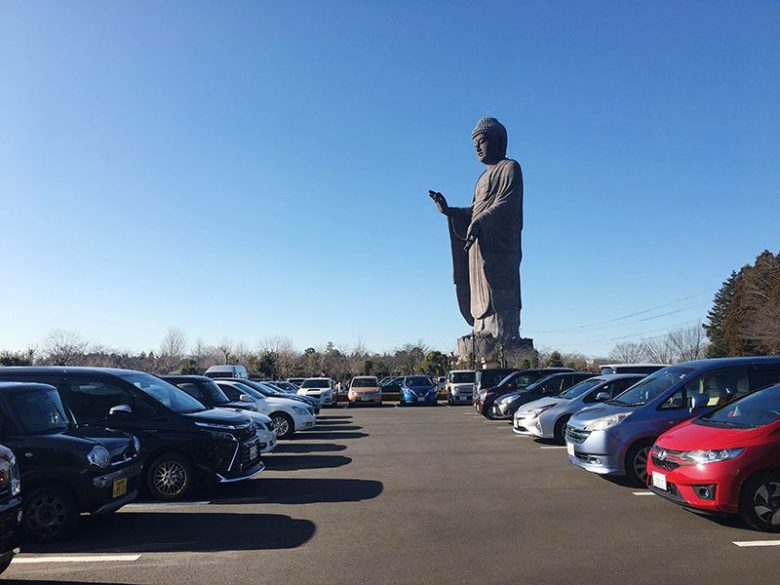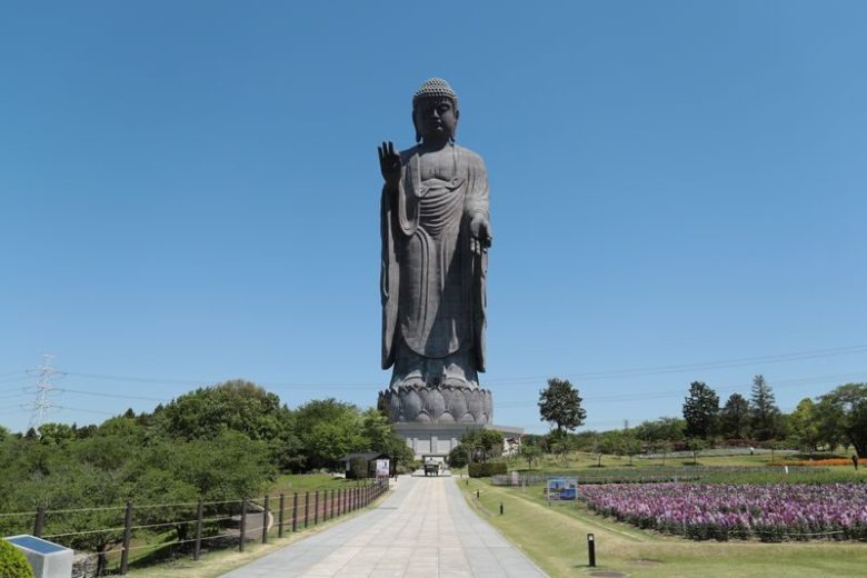 圏央道を走っていて阿見東ICの近くに来ると、巨大な姿を現す牛久大仏(正式名称:牛久阿弥陀大佛)。その迫力は、まるでウルトラマンのよう。思わず「デカイっ」と言ってしまうことでしょう。高さは阿弥陀如来の十二の光明にちなんで120m(像高100m、台座20m)。奈良の大仏(像高14.98m)が掌に乗ってしまうほどの巨大さです。立像の高さでは世界3位、青銅(ブロンズ)製立像としては世界最大で、ギネスブックにも登録されています。